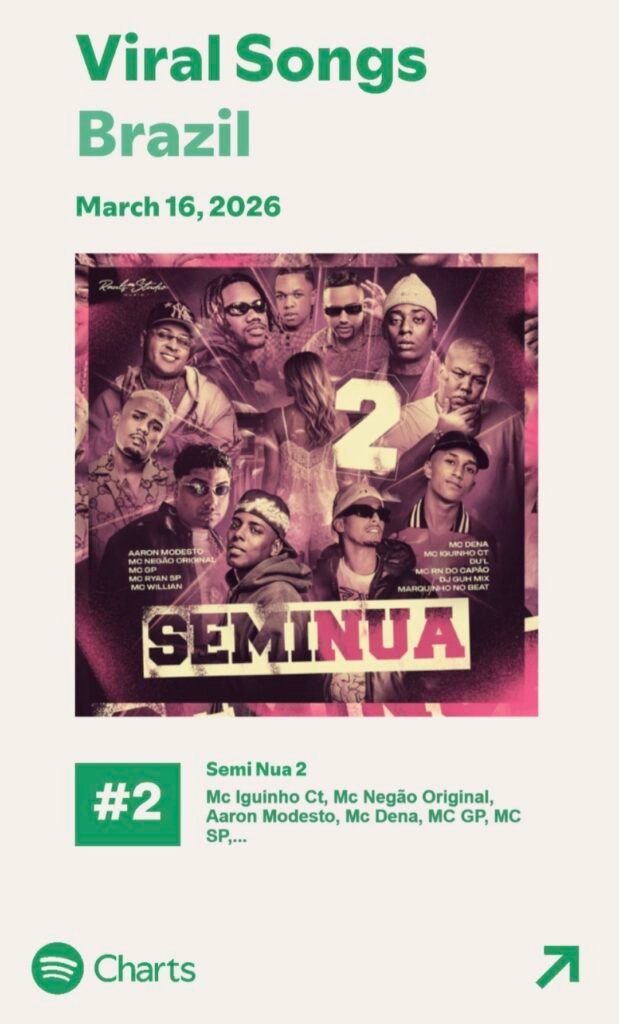 Em sua segunda semana, “Semi Nua 2” não apenas mantém o fôlego como amplia seu impacto, alcançando posições expressivas nos rankings virais do Spotify. A faixa aparece em #3 no Daily Viral Songs Brazil, #14 no Global, #18 em Portugal e ainda marca presença no Top Songs Brasil, na posição #47.